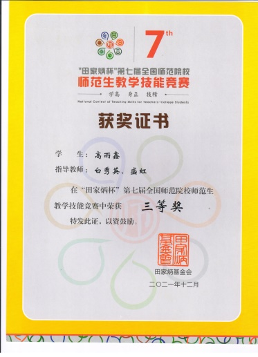 近日,“田家炳杯”第七届全国师范院校师范生教学技能竞赛获奖证书颁发,我校2019级物理学专业高雨鑫荣获三等奖,白秀英、盛虹两位老师获优秀指导老师。