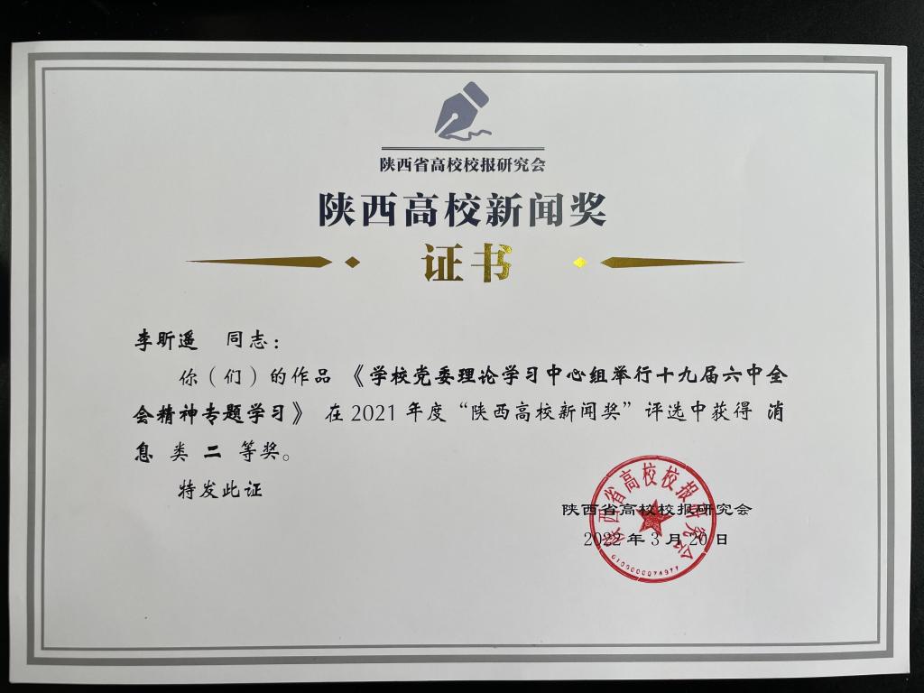 “陕西高校新闻奖”是陕西省高校校报研究会主持评选的行业奖项,每年评选一次,评选范围涵盖消息、通讯、言论、专栏、新闻图片及报纸版面等六大类。