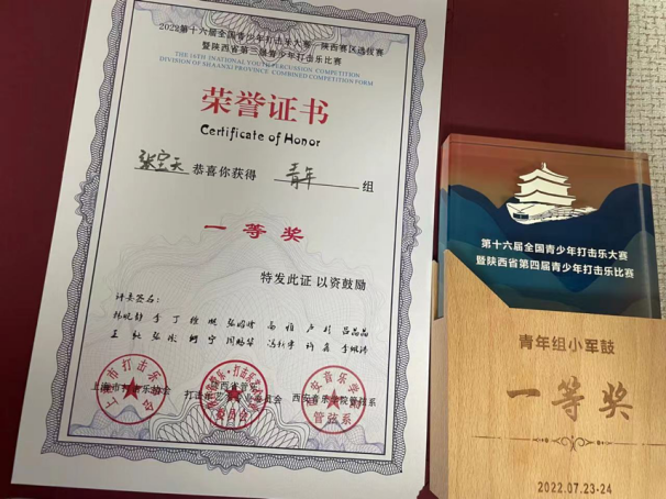 7月23日至24日,我校音乐学院打击乐专业学生赴西安参加第十六届全国青少年打击乐比赛陕西省选拔赛暨第四届陕西省打击乐比赛,该赛事作为国内顶级年度打击乐比赛,也是陕西省最高级别的打击乐专项比赛,我校学生张宝天、张元龙、陈瑶、王春焕、陶静怡、张池田与西安音乐学院、陕西师范大学等高校学生同台竞技参加了多个项目的角逐。其中,张宝天参加青年组小军鼓单项比赛获得一等奖。王春焕参加青年组马林巴单项比赛获得二等奖。