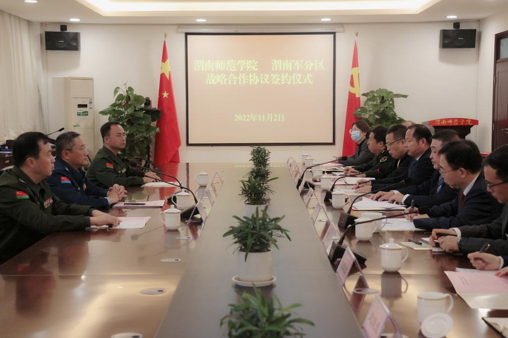 11月2日,我校与渭南军分区签订战略合作协议。党委书记卓宇,校长张守华,党委副书记汪勇,副校长曹强,党委委员、宣传部部长李明敏;渭南军分区大校司令员吴森林、大校政治委员何勇进,动员处上校处长王亚强出席会议。会议由张守华主持。