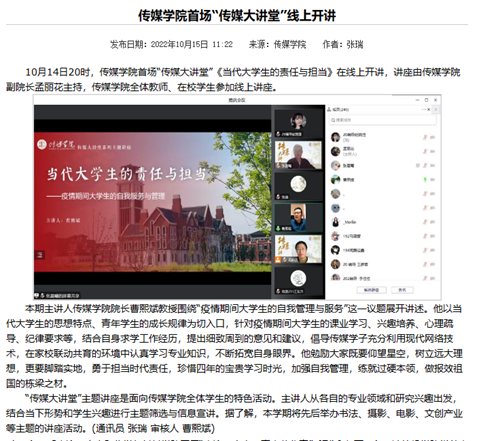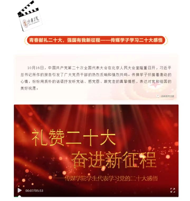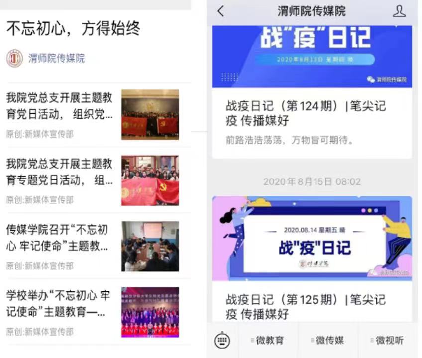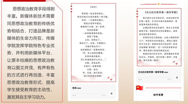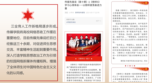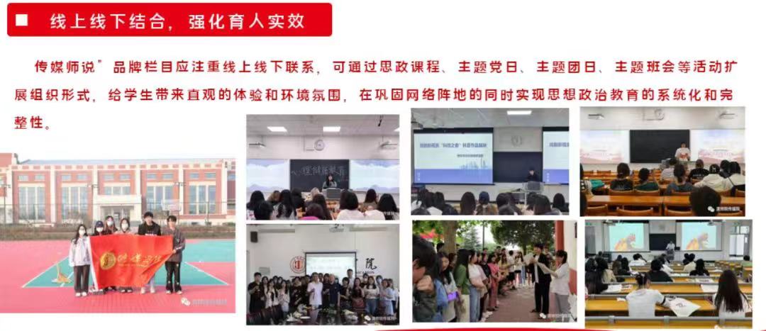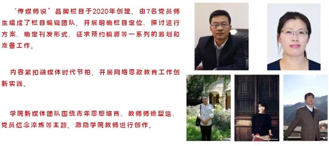 2020年初,新冠肺炎肆虐,居家抗“疫”、线上教学成了学院师生的生活和教学方式,学院利用融媒体时代特点,在官方微信公众号及时开设网络党建与思想政治教育专栏“传媒师说”,栏目紧密围绕学院党建工作,紧扣基层党建与立德树人实践,坚持文化传承与创新并重,以学院教师和优秀校友的典型事迹作为网络育人主体,创建多角度、全方位的育人环境,在增强网络思政教育吸引力、发挥网络思政凝聚力和引领青年思想方面发挥了重要作用。“传媒师说”从学习读书、考研就业、日常生活等各个方面阐发教师的思考,在平凡的生活和学习中培养青年学生的思想品德和专业技能,进一步引导青年学生树立正确的价值观,让立德树人融入教学的各个环节。学院申报的《网络党建与思想政治教育品牌专栏“传媒师说”创设》荣获学校2020年校园文化建设优秀成果二等奖。截止目前,“传媒师说”栏目已更新69期,深受师生欢迎。