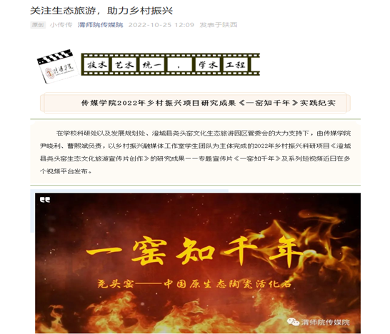 从2018年开始,学院立足国内外影视发展的实际,及时调整培养方案并推出了特色活动“微电影大赛”,紧接着又推出了“传媒学院奖”的评选活动。从2018年至今,学院每年的“微电影大赛”都紧扣时代主题、弘扬主旋律,光影交错中鼓励学生不断努力奋进,在追梦路上不断前行。动画专业师生参与“秦兵马俑数字化保护”项目;师生创作的建筑漫游片《白水仓颉庙漫游》和数字化展示作品《白水县仓颉庙虚拟展示系统》被白水县委宣传部采用,彰显了动画专业在新的三维数字化技术应用水平和服务地方优秀传统文化“两创”方面的能力和优势。戏剧影视美术设计专业师生排演的校园红色舞台剧《渭华回响》,融党史学习教育与思想启迪于一体,剧情感人,发人深思,富有教育意义。学院师生创作的纪录片《我的爷爷付自善》《一窑知千年》等作品被各大媒体竞相转载,社会反响良好。