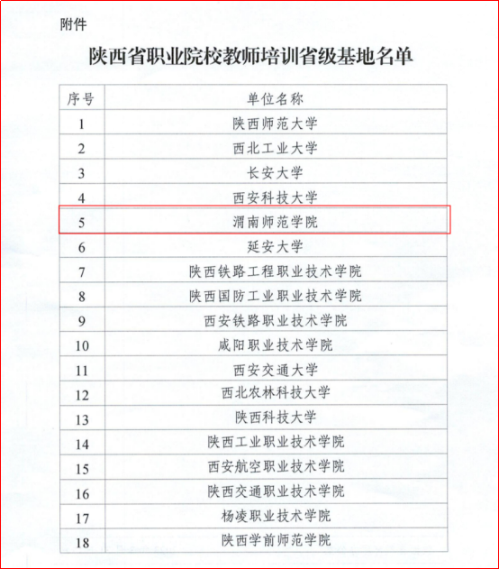 近日,陕西省教育厅办公室印发《关于公布省级职业院校教师培训基地名单的通知》(陕教职办〔2023〕7号),我校成功获批陕西省职业院校教师培训省级基地(以下简称“省级基地”)。本次共认定18所院校为省级基地,其中10所院校为新增基地。这是继我校获批“陕西省中小学教师培训基地”后,获批的又一个省级培训基地。