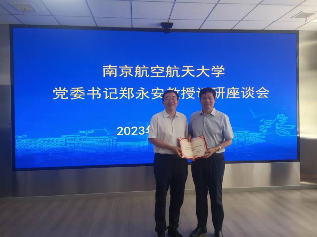在调研交流座谈会上,我校副校长曹强介绍了学校基本情况。郑永安围绕“发展、奋斗、融合、特色”等关键词,分享了南京航空航天大学在人才引进、科学研究、教师队伍建设、学科建设、马克思主义学院建设等方面的典型经验做法,就校园精神文明建设、加强校地合作、推进新校区建设等与参会人员进行了交流,并共同探讨了推动高等教育高质量发展的路径。他指出,推动学校高质量发展要胸怀国之大者,响应国家发展需要,找好大思路、把好大方向;要重视发挥集体作用,营造良好氛围;要积极为教师、学生及学校发展挖掘更广泛的优质资源;要关心教师发展和学生成才,凝聚起学校发展的强大力量。