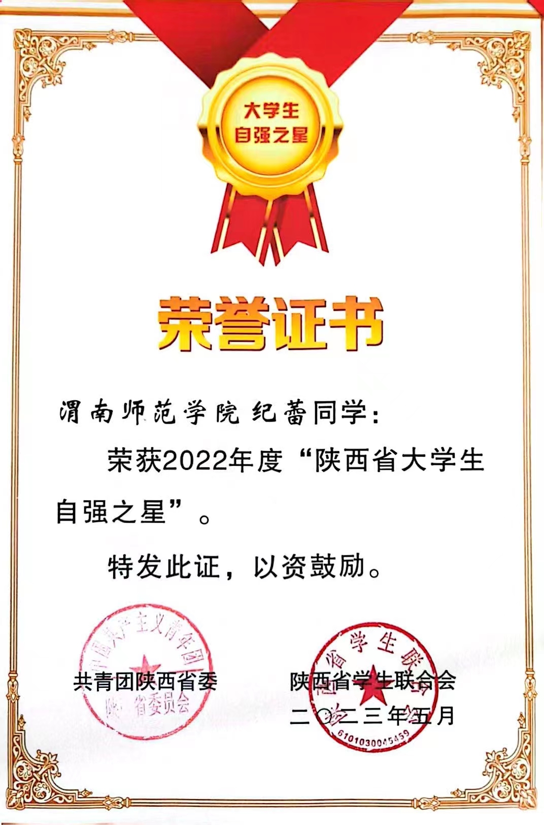 近日,由共青团中央、全国学联指导,中国青年报社、新东方教育科技集团、中国青年创业就业基金会联合开展的2022年度“中国大学生自强之星”推报活动结果揭晓。经学校团委推荐、省级初评、全国评审等环节,我校来自人文学院汉本194班纪蕾和数学与统计学院学院数本211班雷欣如双双入选,荣获2022年度“中国大学生自强之星”奖学金,获奖人数再创新高。
