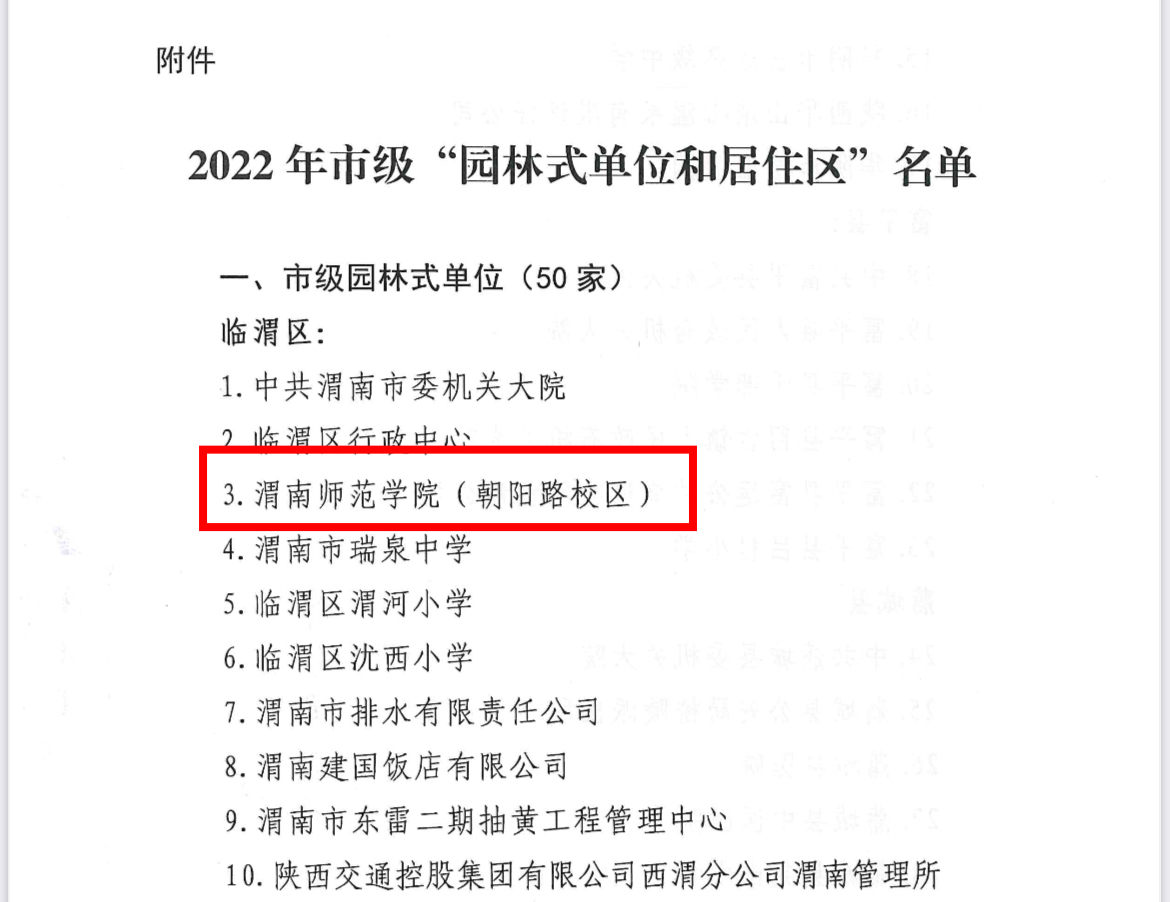 近日,渭南市印发《关于开展市级园林式单位和园林式居住区“双创”活动的通知》,我校被评为渭南市“市级园林式单位”。