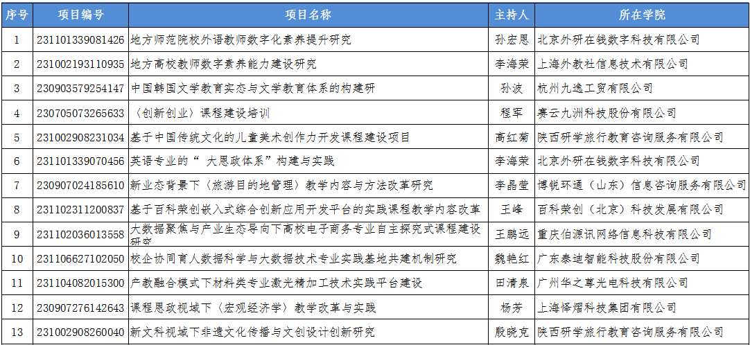 此次学校立项的14个项目获得了北京外研在线数字科技有限公司、广州凯园软件科技有限公司、上海怿熠科技集团有限公司、陕西研学旅行教育咨询服务有限公司等多家知名企业的支持,校企协同致力于新工科建设、教学内容和课程体系改革、创新创业教育改革、师资培训、实践条件和实践基地建设。