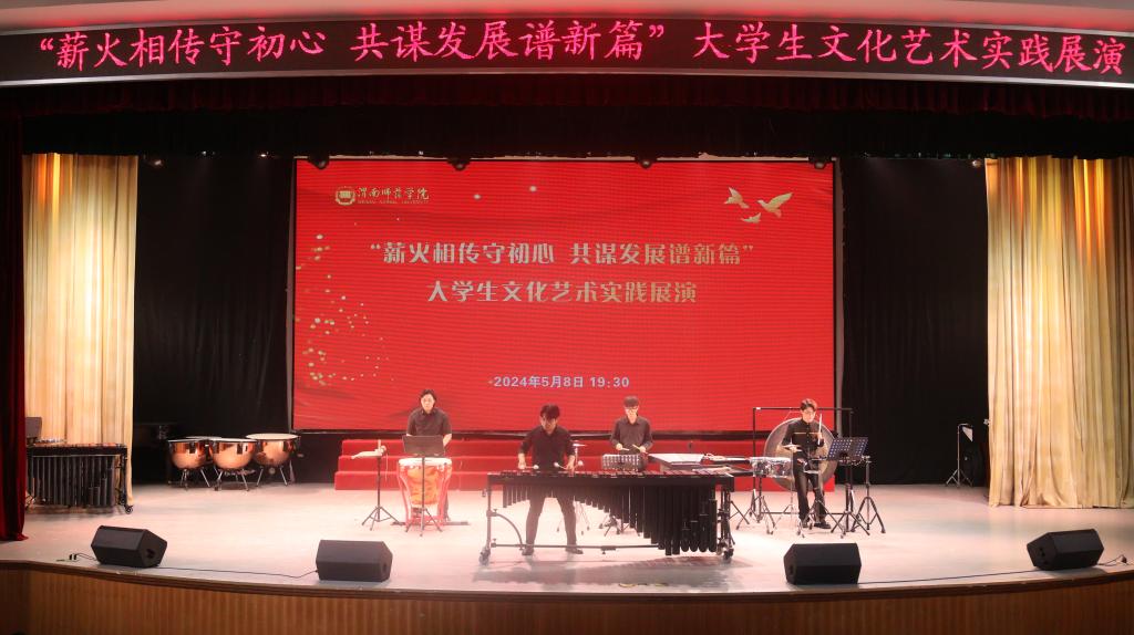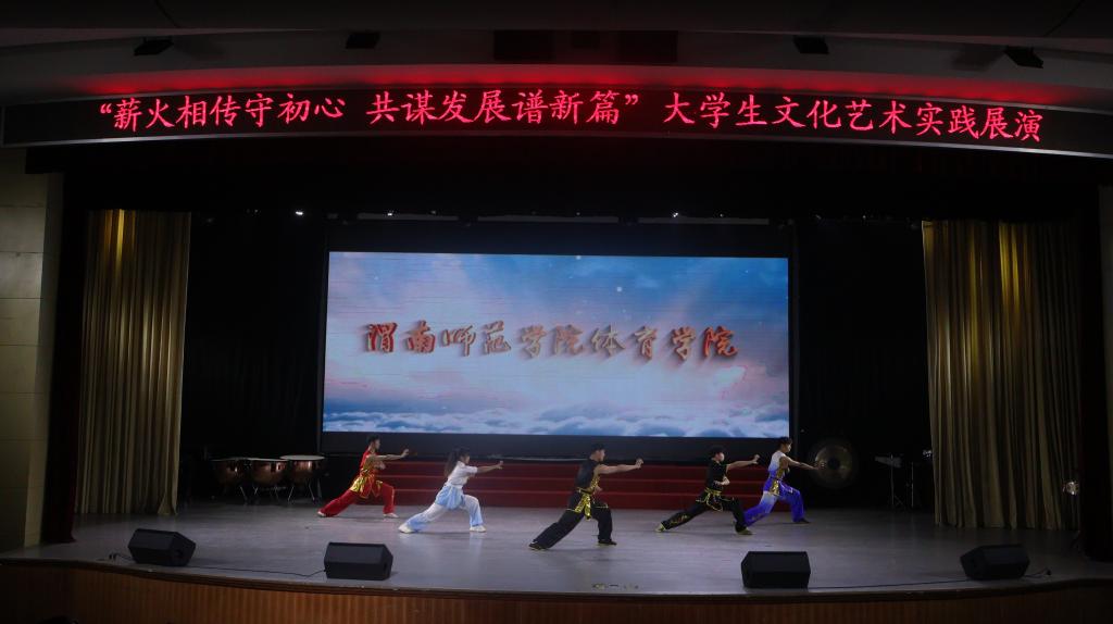 展演在打击乐《鼓动中国》中拉开帷幕,共分上下两个篇章。来自音乐学院、莫斯科艺术学院、体育学院、外国语学院的13个节目,主题鲜明、催人奋进。展演以悠扬的器乐、婉转的唱腔、灵动的歌舞、深情的诵读、精彩的武术等丰富多彩的艺术形式,展现了渭师青年与时代同向、与祖国同行,胸怀家国、奋力逐梦的价值追求,展示了渭师学子朝气蓬勃、自信昂扬、奋发进取的精神风貌,进一步展示出我校六十四载立德树人守初心,深耕教育践使命的坚守,生动地呈现了我校寓思政教育于文化活动之中,不断加强校园文化品牌建设,打造富有渭师范特色的全覆盖、高质量美育体系取得的实效。