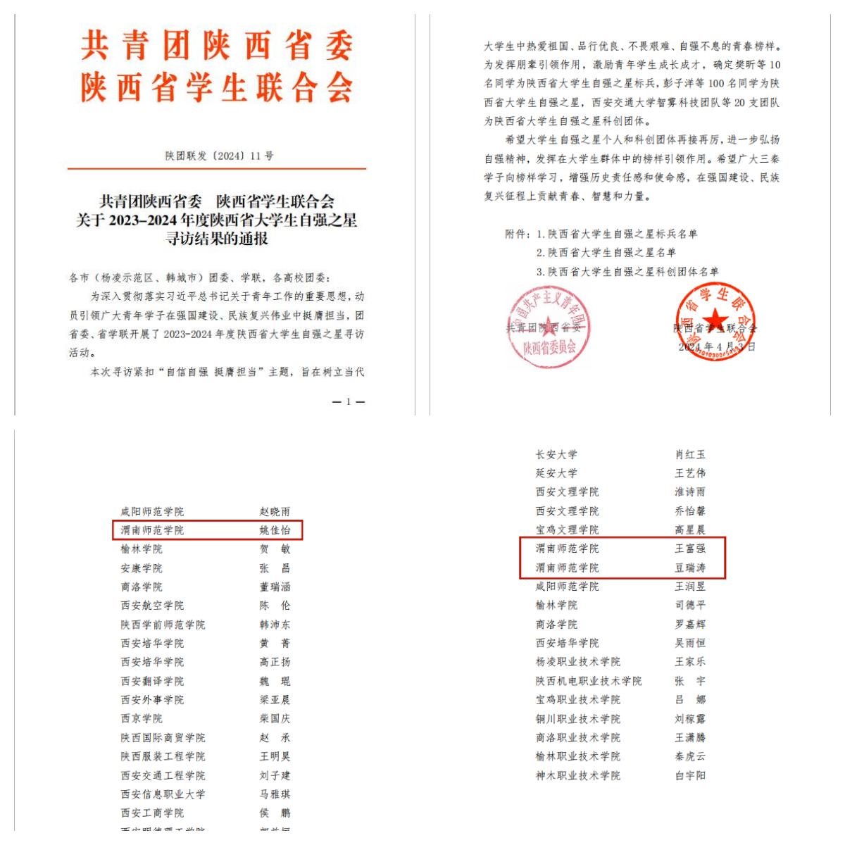 近日,2023-2024年度“陕西省大学生自强之星”寻访结果正式揭晓,教育科学院2021级教育学专业211班学生姚佳怡、计算机学院2021级软件工程专业211班学生王富强、计算机学院2021级软件工程专业211班学生豆瑞涛荣获“陕西省大学生自强之星”称号。