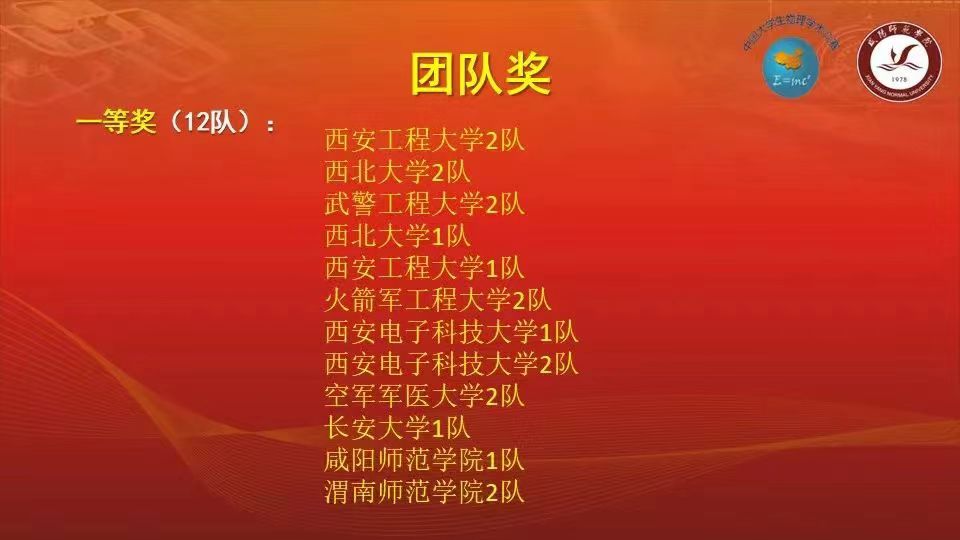 5月25日,由陕西省物理学会主办,咸阳师范学院物理与电子工程系承办的2024年陕西省大学生物理学术竞赛(线上)比赛开赛,我校物理与电气工程学院12名学生参加了此次竞赛,经过激烈角逐,最终从陕西省16所高校的33支参赛队伍中脱颖而出,分别获得个人一等奖九项,个人二等奖三项,同时还获得团体一等奖的好成绩,实现了我校自参加该赛事以来获奖的新的突破。