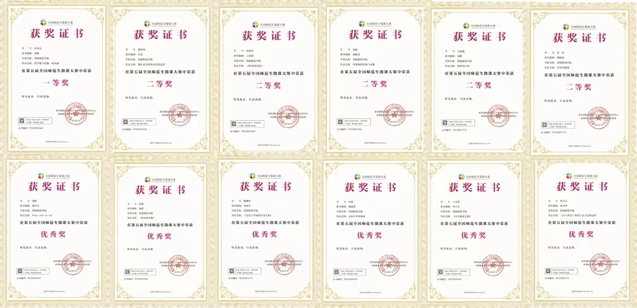 近日,第五届全国师范生微课大赛公布了获奖名单,我校共有20项参赛作品获奖,其中特等奖2个、一等奖7个、二等奖5个、优秀奖6个。我校获“优秀组织单位奖”,苗蓉、杨秀英获优秀指导教师奖。