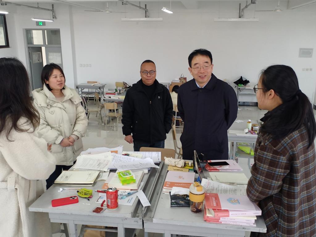在调研过程中,张守华深入美术学院的《室内设计Ⅱ(商业空间)》和《篆刻临摹Ⅱ》课堂,观摩教学活动,并与教师及学生进行了深入的交流。他细致地了解教学过程中遇到的难点以及学生的反馈意见,并在此基础上提出了具有建设性的优化建议。他希望教师们树立大思政的课程理念,充分利用富平的红色资源,将理论与现实生活结合,引导学生从个体生活拓展到社会、国家层面的认知,帮助学生形成正确的价值观。他建议学生们围绕校长办公楼正在开展的“一站式”学生社区建设进行创新设计,打造多功能互动空间,促进师生交流,提升社区育人实效。学生们的作品要围绕教育家精神、富平地方文化等主题展开创作,并结合国际妇女节、母亲节等节日进行作品的设计。