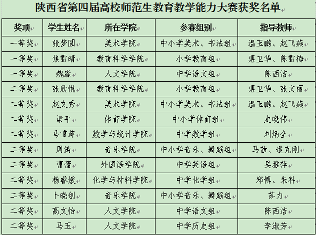 近日,陕西省第四届高校师范生教育教学能力大赛决赛成绩揭晓,我校共有13名师范生参加了语文、数学、英语、历史、化学、小学教育、美术书法、音乐舞蹈、体育等9个学科的省级决赛,最终获得一等奖3项、二等奖10项。
