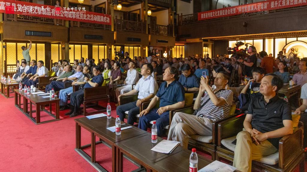 我校党委书记张守华,党委副书记、纪委书记、监察专员肖耀刚,原陕西省委组织部副部长田晓东,原陕西省新闻出版广电局副局长任中南,西安易俗社原社长冀福记,当代著名诗人、歌词作家党永庵,中国艺术研究院博士生导师何玉人,以及渭南市秦腔剧团总经理代九奎,富平阿宫剧团团长王革委,中国工艺美术大师薛宏权,陕西传统文化促进会秘书长郑欣、副秘书长王新妮,富平艾合瑞艾草制品厂董事长郭炳行等莅临现场。演出由陕西电视台著名主持人陈爱美主持。