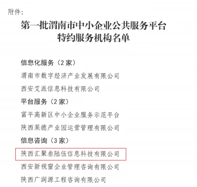 5月26日,渭南市工业和信息化局公布首批中小企业公共服务平台特约服务机构名单,我校大学科技园入驻企业陕西叁陆伍信息科技有限公司凭借其在企业服务领域的专业能力与突出贡献成功入选,成为首批中小企业公共服务平台特约服务机构。