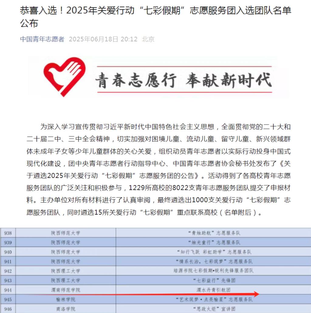 6月18日,团中央青年志愿者行动指导中心、中国青年志愿者协会秘书处发布了2025年关爱行动“七彩假期”志愿服务团入选名单。我校“渭水丹青引航团”项目,从全国1229所高校的8022支团队中脱颖而出,成功入选国家级志愿服务团队。