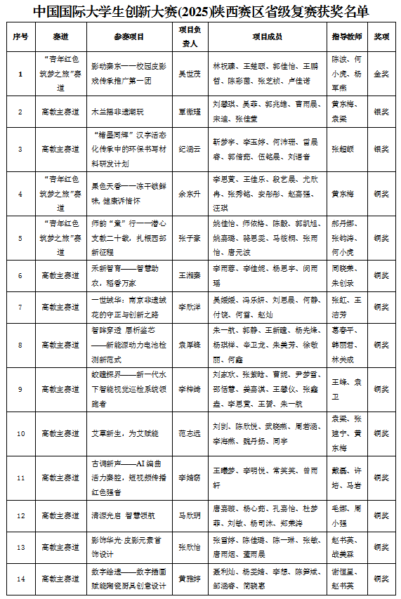 近日,陕西省教育厅公布了中国国际大学生创新大赛(2025)陕西赛区省级复赛结果。经过网络评审、现场路演答辩以及终审会评,我校参赛项目获金奖1项、银奖2项、铜奖11项,陈波老师获优秀指导教师,《影动秦东——校园皮影戏传承推广第一团》《影动秦东——校园皮影戏传承推广第一程》荣获“青年红色筑梦之旅”活动实践典型案例。