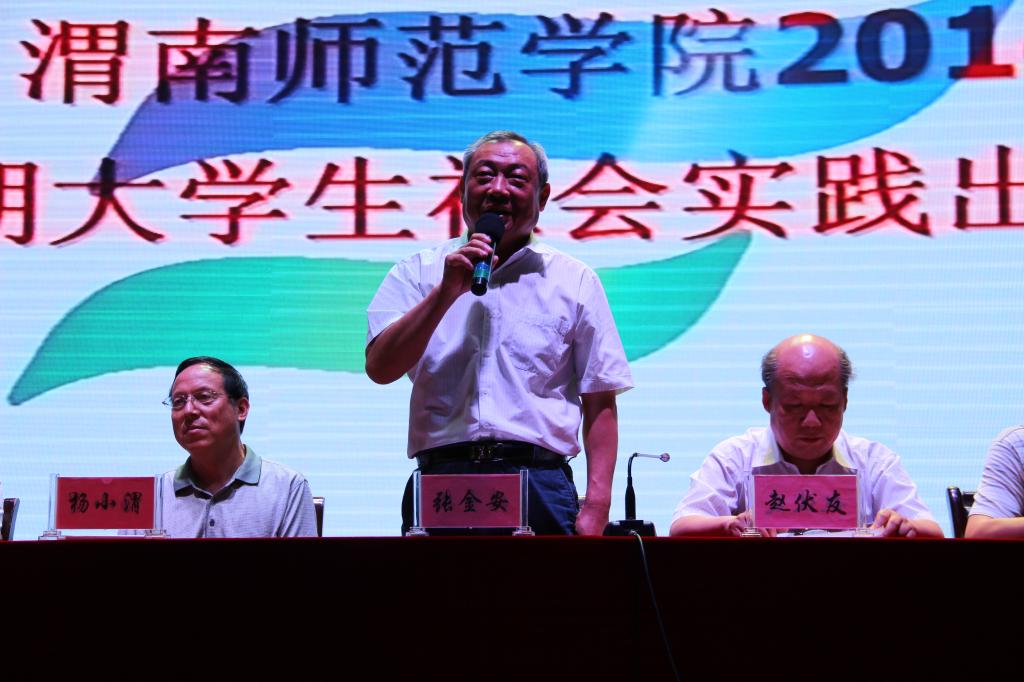 校党委书记张金安宣布我校2014年大学生暑期科技文化卫生“三下乡”社会实践队出征。随后,与会领导和老师为我校社会实践骨干团队授旗。