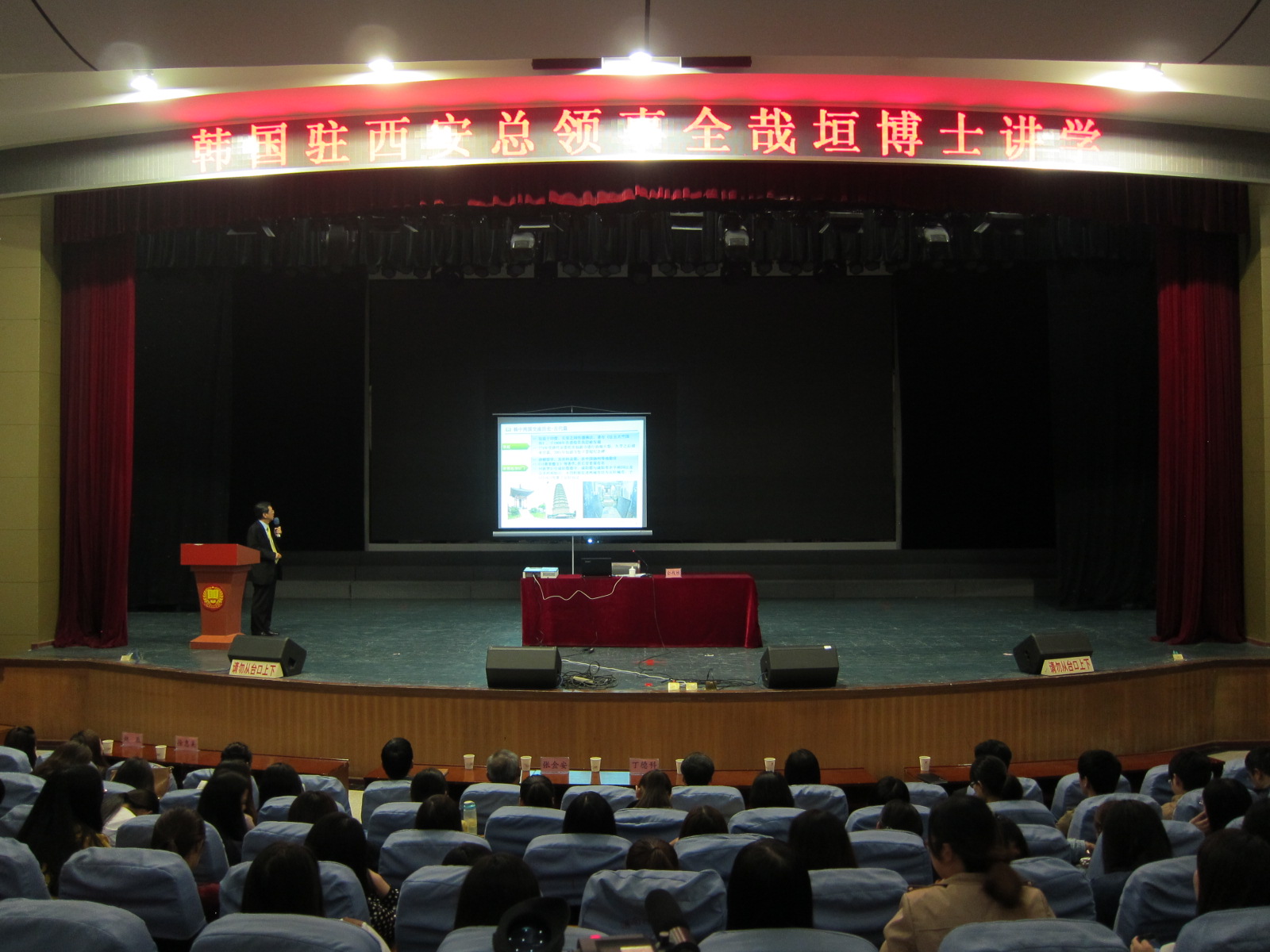讲座分为两大部分。一是韩中两国在古代、近代及建交22周年的交流历史,全哉垣博士首先着重讲到两国在人文、贸易等方面的战略合作友好关系。同时,介绍了陕西与韩国共谋发展的密切合作。二是介绍了韩国高等教育的发展历程、制度体系以及富有民族特色的校园文化,使我校师生对中韩渊源流长的友好历史、对韩国教育、留学韩国、文化特点等有了较广泛的了解、较深刻的印象。讲座结束后,总领事全哉垣与师生进行了互动交流,详细解答了大家的疑惑。