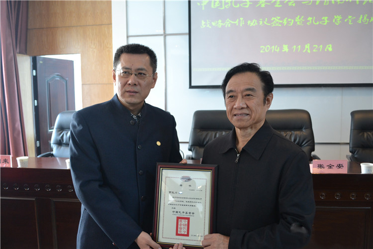 中国孔子基金会对外合作交流委员会主任杨光与我校人文与社会发展学院院长凌朝栋在合作协议上签字。中国基金会理事长王大千与党委书记张金安为孔子学堂揭牌。中国孔子基金会还聘请我校渭华学者贾巨川教授为中国孔子基金会孔子学堂主讲教授,王大千理事长为其颁发聘书。