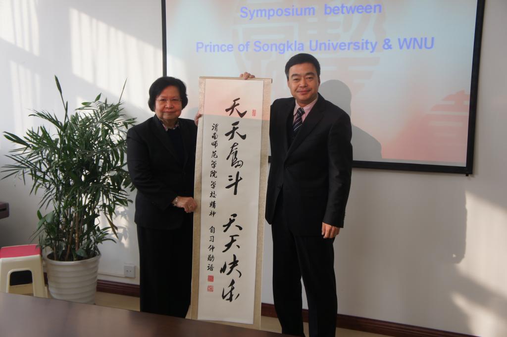 丁院长首先对到访客人表示热烈欢迎,并介绍了我校的历史沿革、办学特色、对外交流情况以及未来的发展规划。Sontaya Anakasiri院长介绍了宋卡王子大学所处的位置、办学历史、课程设置、教学设施、培养模式、优势专业等。双方就开展汉语言文学、国际贸易、音乐舞蹈等专业的教育合作以及学生互换深入交换了意见,并达成一致共识。丁院长向泰国宋卡王子大学赠送了“天天奋斗,天天快乐”的学校精神书法条幅和《史记精华》。
