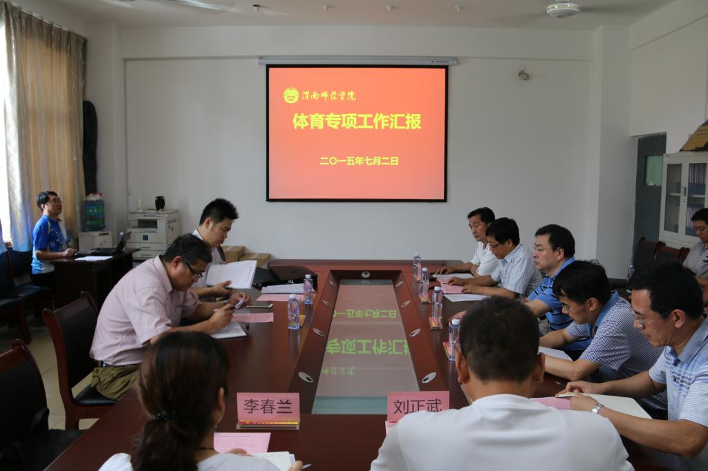 7月2日下午,教育厅体育工作督查组省学生体协常务副秘书长张原耕一行来我校检查指导工作。副院长程书强,体育学院院长张虎,教务处副处长刘军、席景奇,体育学院党政领导及体育教育专业建设负责人、实验室主任、教研室主任等参加了汇报会。会议由教务处处长李尧龙主持。