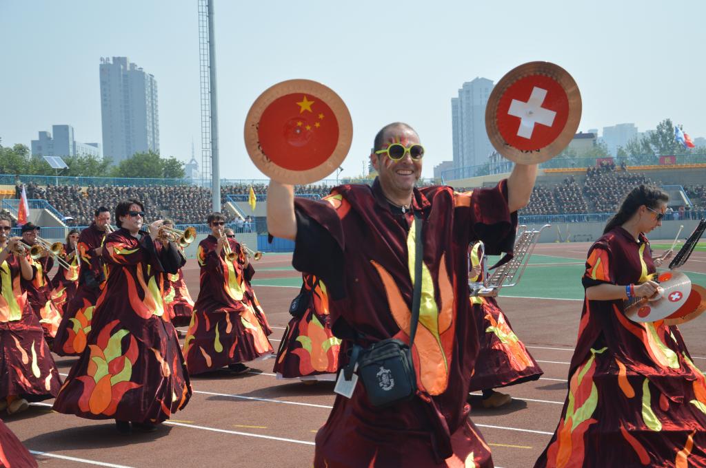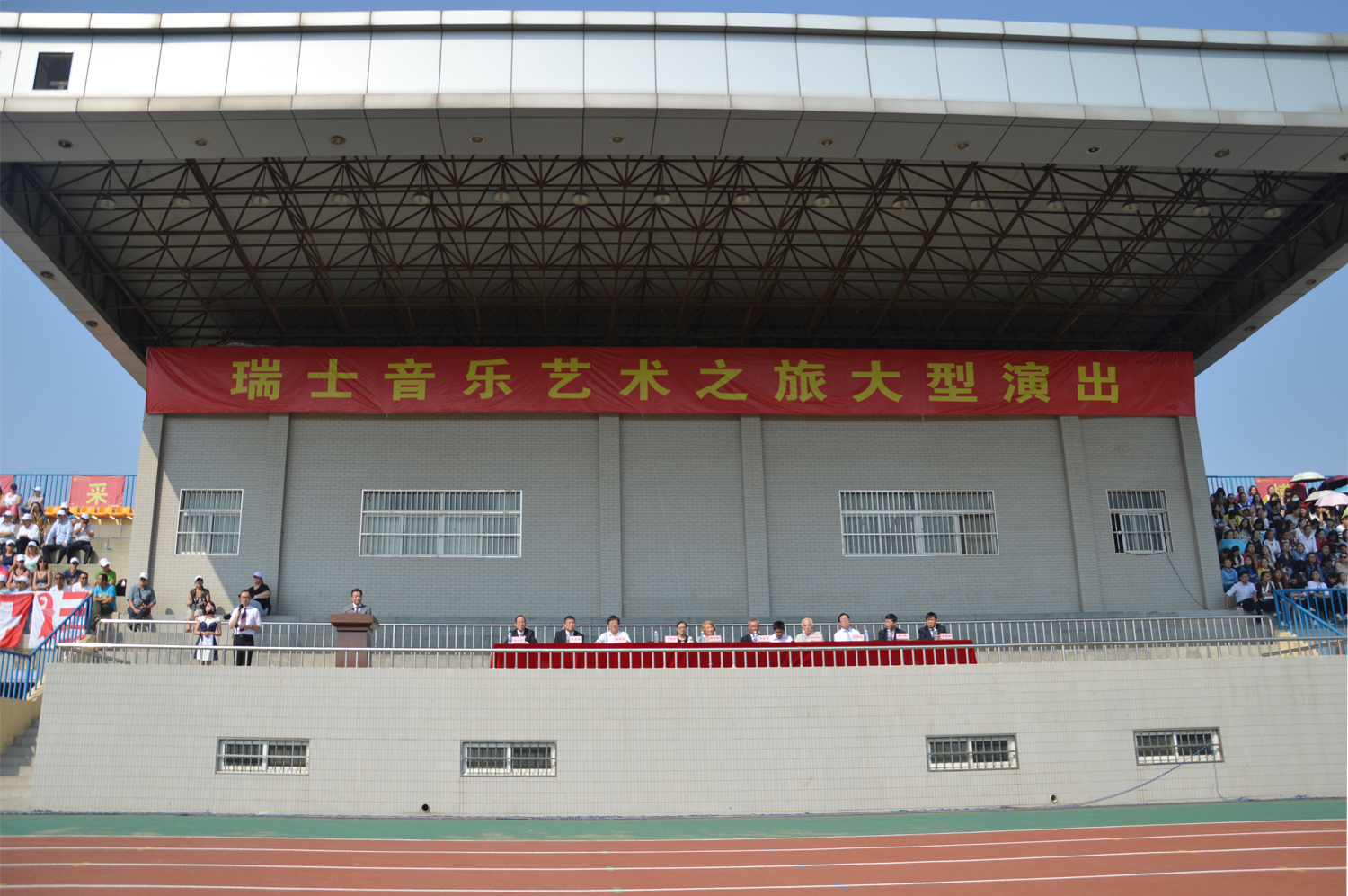 瑞士音乐艺术之旅代表团在友好热烈的气氛中为我校师生表演了歌舞演奏节目。表演最后,所有演出人员绕田径场一周与现场师生进行了友好的互动,现场师生热情高涨,掌声如潮,表达了对远道而来的客人真诚的敬意。