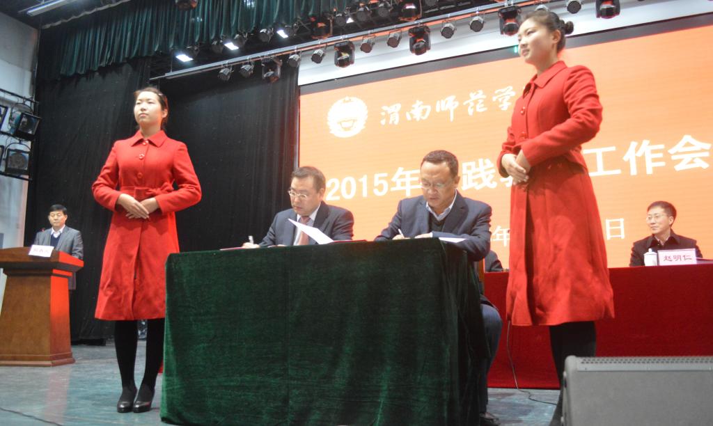 开幕式上,我校党委书记张金安首先致辞,他对参会的实践教学基地代表表示热烈欢迎,对我校基本情况、人才培养模式改革及学生实践技能、创新精神、创业能力培养的措施及成效等作了简要介绍。渭南市教育局副局长柴新宏和欧宝娱乐官方app副院长程书强共同签订了渭南市教育局与欧宝娱乐官方app战略合作协议书,以校地合作提升地方教育质量,推动校地教育事业又好又快发展,实现共赢。临渭区教育局局长闵渭安作了题为《校地教育合作经验介绍》的大会发言,西安唐翰网络科技有限公司副总经理段永雷作了题为《校企合作人才培养经验》的大会发言。随后,程书强作了题为《强化实践教学环节,创新实践教学模式,培养坚定创业创新的高层次应用型人才》的主题报告,全面介绍了我校近年来实践教学改革的措施与成效,指出了存在的主要问题与不足,并提出今后改革的思路。