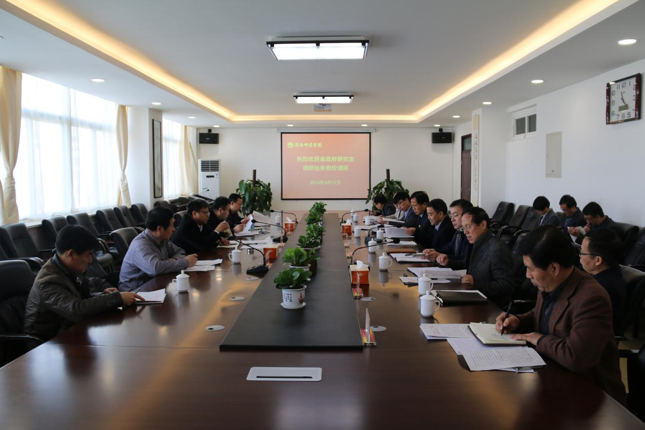 3月11日,省政府研究室主任杨三省到我校调研并召开座谈会。省政府研究室秘书处调研员田民孝、省政府研究室社会处赵理顺、省政府研究室秘书处李靖宇等陪同调研。
