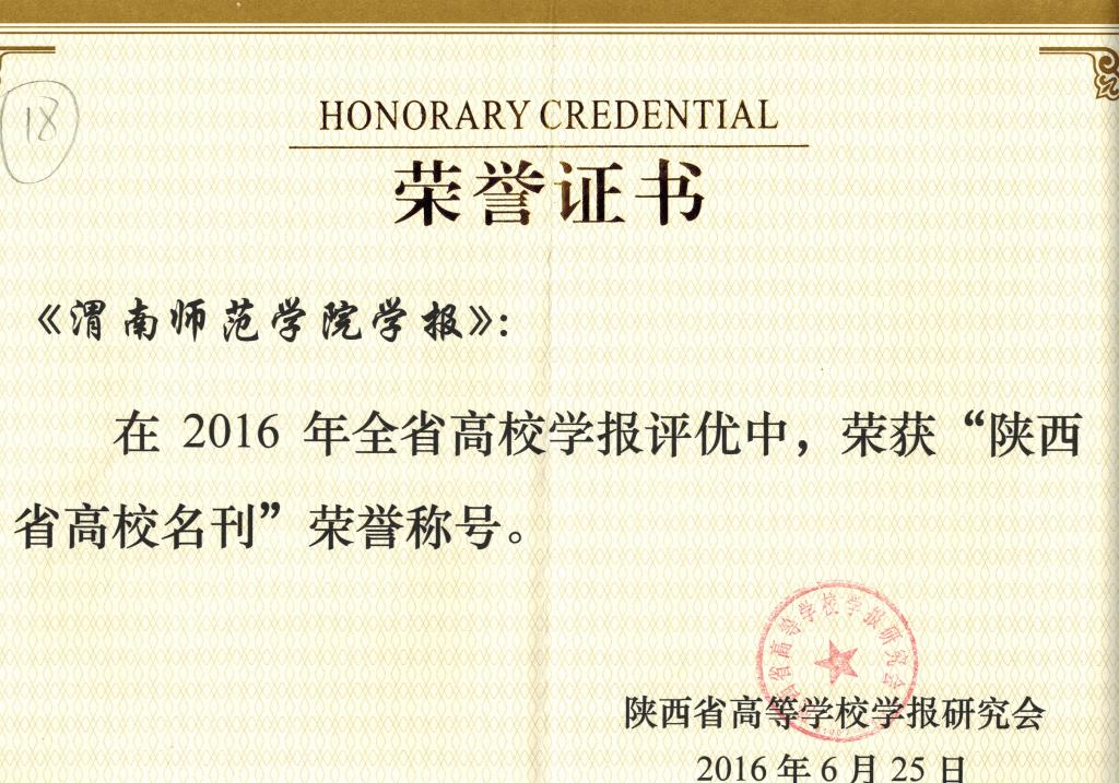 2016年6月30日至7月1日,陕西省高等学校学报研究会2016年学术年会在延安举行。会议公布了陕西高校学报研究会“四优评比”结果,《欧宝娱乐官方app学报》首次进入“陕西省高校名刊”序列,并取得了陕西高校学报优秀编辑部、优秀主编、优秀编辑、优秀编辑学论著共10项荣誉。本次评比在参评的百余家高校学术期刊中评选出“陕西省高校名刊”共18家,其中高校社科学报9家,是陕西高校学报队伍的第一梯队。《欧宝娱乐官方app学报》是“陕西省高校名刊”方阵中唯一一家地方院校主办的高校学术期刊。