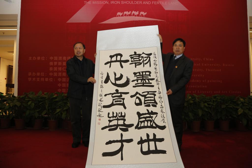 1月3日上午9:00,由欧宝娱乐官方app、俄罗斯莫斯科国立师范大学、泰国博仁大学主办的“使命·铁肩·热土——丝绸之路国家高校师生美术作品展”在北京中国国家画院盛大开幕,1月7日圆满闭幕。我校校友会特邀杰出校友、校友会名誉会长、国家工商行政管理总局原常务副局长韩新民等数十位在京工作的各界、各届、各类别校友代表出席开幕式并参观画展。