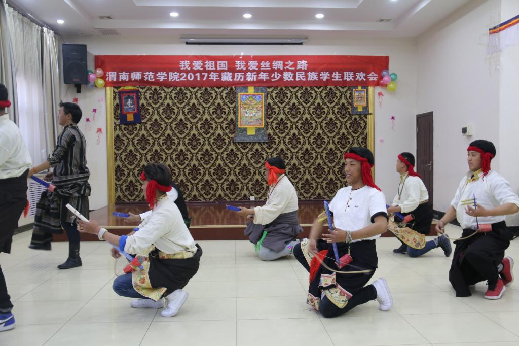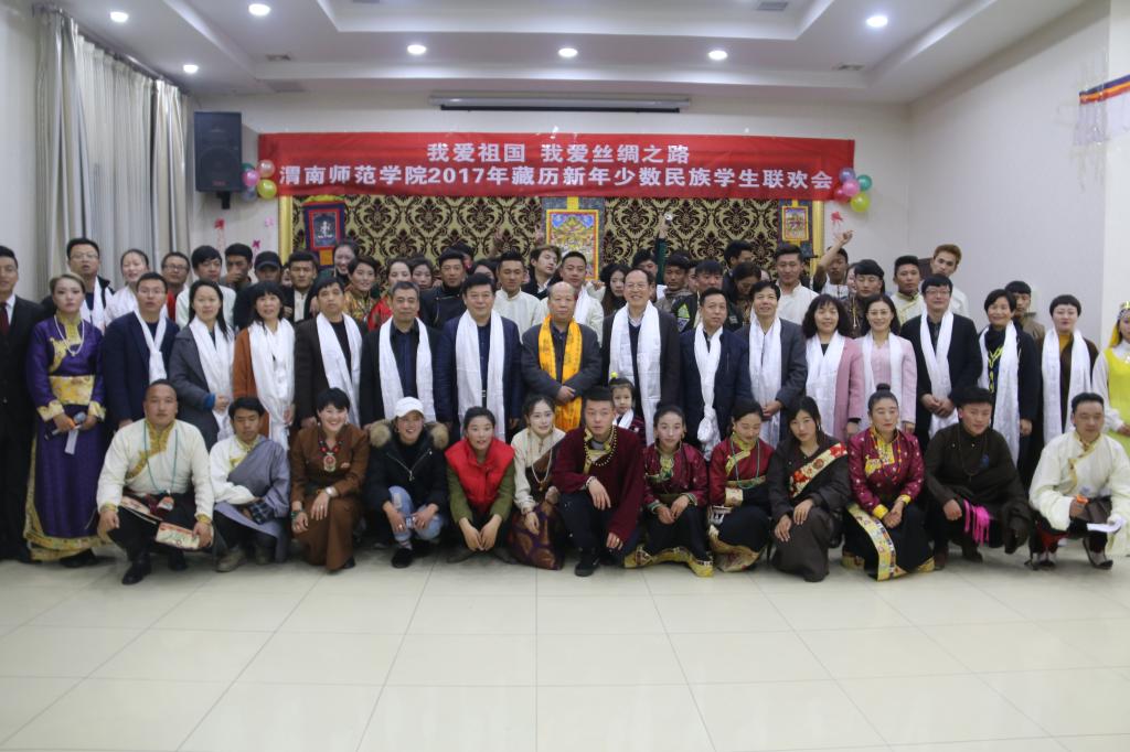 2月26日,是藏历新年的“朗嘎”,相当于汉族传统的除夕。26日晚,学校在学校农园餐厅举行了以“我爱祖国我爱丝绸之路”为主题的“庆祝2017年藏历新年少数民族学生联欢会”。活动旨在为少数民族学生营造温馨和谐的大学生活氛围,打造各民族学生互动的平台,增强各民族学生之间的交流,展现学生风采,传递校园温暖,促进民族团结。学校党委副书记赵伏友,校党委委员、组织部长杨小渭,教务处长王菊霞,统战部长、人事处长赵江永,学工部(处)长王俊安、科技发展集团总经理王居海,团委副书记姚明亮等相关部门负责人及各二级学院领导、学校全体藏族学生和其他民族学生代表约200人参加联欢会。