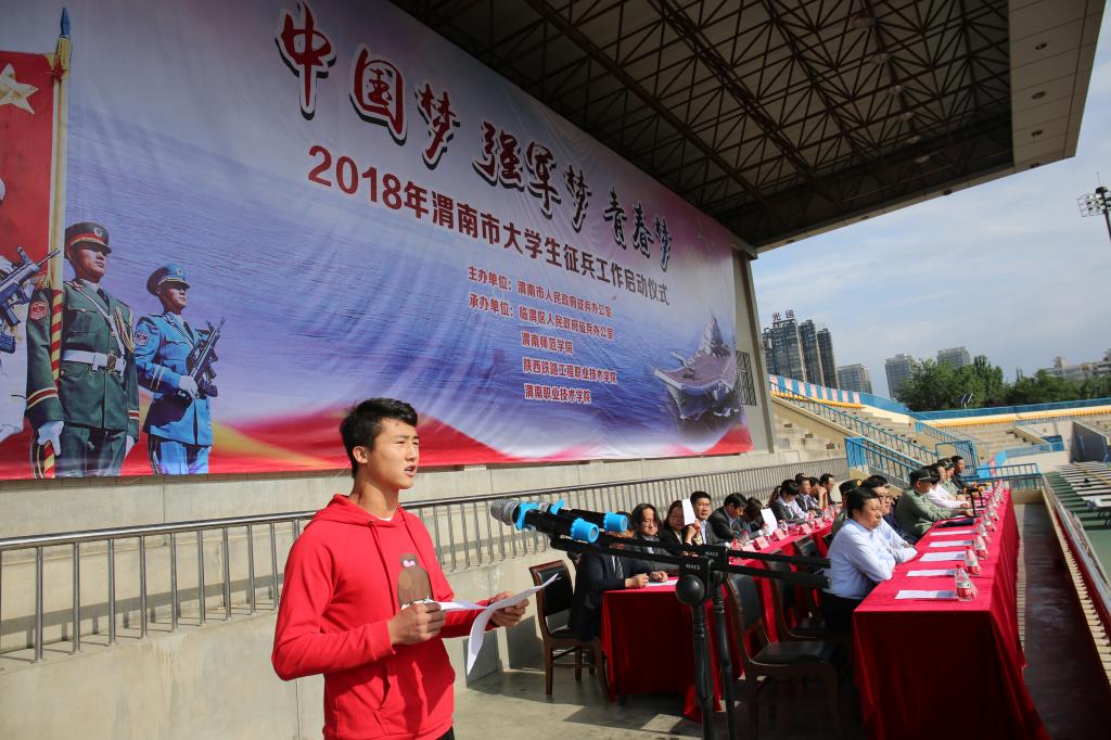 5月11日上午,渭南市2018年大学生征兵启动仪式在我校田径运动场举行。渭南市委常委、常务副市长、市征兵工作领导小组组长张建军,市委常委、市征兵工作领导小组副组长军分区政治委员孔令锷、政治工作处主任侯鉴、动员处处长沈礼军,临渭区常务副区长王小奇,临渭区人武部部长吕拥军、政委王忠文,欧宝娱乐官方app院长卓宇、党委副书记任健,人武部部长崔启、副部长陈景西,各二级学院副书记,陕西铁路工程职业技术学院、渭南职业技术学院有关领导,我校师生共1800余人参加了启动仪式。