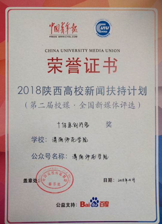 近日,由共青团中央学校部指导,中国青年报社、中国高校传媒联盟主办,百度公益支持的第二届校媒·全国新媒体评选结果公布,我校官方微信公众平台荣获新媒体十佳原创内容奖。