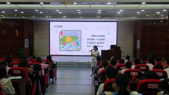 下午,渭南小学附属幼儿园教研组长,临渭区教学能手李卓,为各位老师做了一场题为“看小小图”的讲座,让老师们受益匪浅。李卓以故事创编为线索,首先向大家解释了看图创编是什么,看图创编中理解、积累、教育、创造的重要性,接着用身边的例子剖析了为什么要进行看图创编,看图创编对孩子语言能力的锻炼,让孩子想说,敢说,爱说。最后,李卓用大量的事例从故事创作、表情动作、语言流利等角度阐述了看图创编要怎么做。新鲜有趣的看图创编形式,引起了场上学员浓厚的学习兴趣。在最后实战演练环节,纷纷上台展示自己所学。