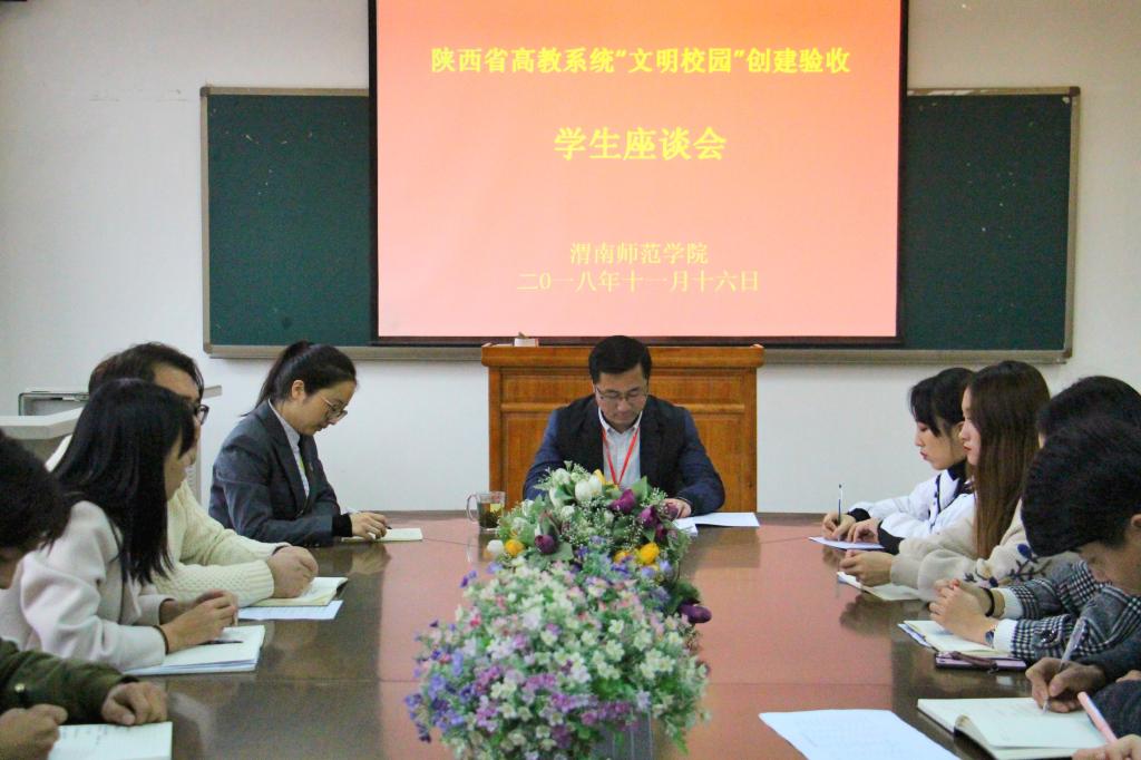 11月16日,陕西省高教系统“文明校园”创建验收专家组莅临我校验收“文明校园”创建工作。专家组由西北大学党委常委、宣传部部长田明纲,西安工程大学国内合作与校友工作处处长杨永革,西安理工大学马克思主义学院院长、教授、博导鲁宽民,西安外国语大学党委委员、宣传部部长赵沛,西安体育学院宣传部部长高月宏组成。