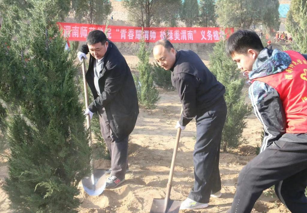 植树现场一派热火朝天的景象。在渭南市林业局技术员的指导下,学生志愿者领取、运送树苗,卓宇书记和赵曼校长同大家一起清理树坑,回填虚土,按照“三埋两踩一提苗”的植树标准,扶苗、培土、踩实、围堰。植树间隙,卓宇书记和赵曼校长不时关心地询问学生志愿者的学习、生活和参与学校义务劳动的情况,勉励同学们按照习近平总书记在全国教育大会上提出的“要在学生中弘扬劳动精神,教育引导学生崇尚劳动、尊重劳动,懂得劳动最光荣、劳动最崇高、劳动最伟大、劳动最美丽的道理,长大后能够辛勤劳动、诚实劳动、创造性劳动”的要求,积极参加劳动,努力成长为德智体美劳全面发展的社会主义建设者和接班人。按照此次义务植树的安排,我校共完成46株蜀桧树苗的栽植任务,渭南市林业局向我校发放了合格证书。