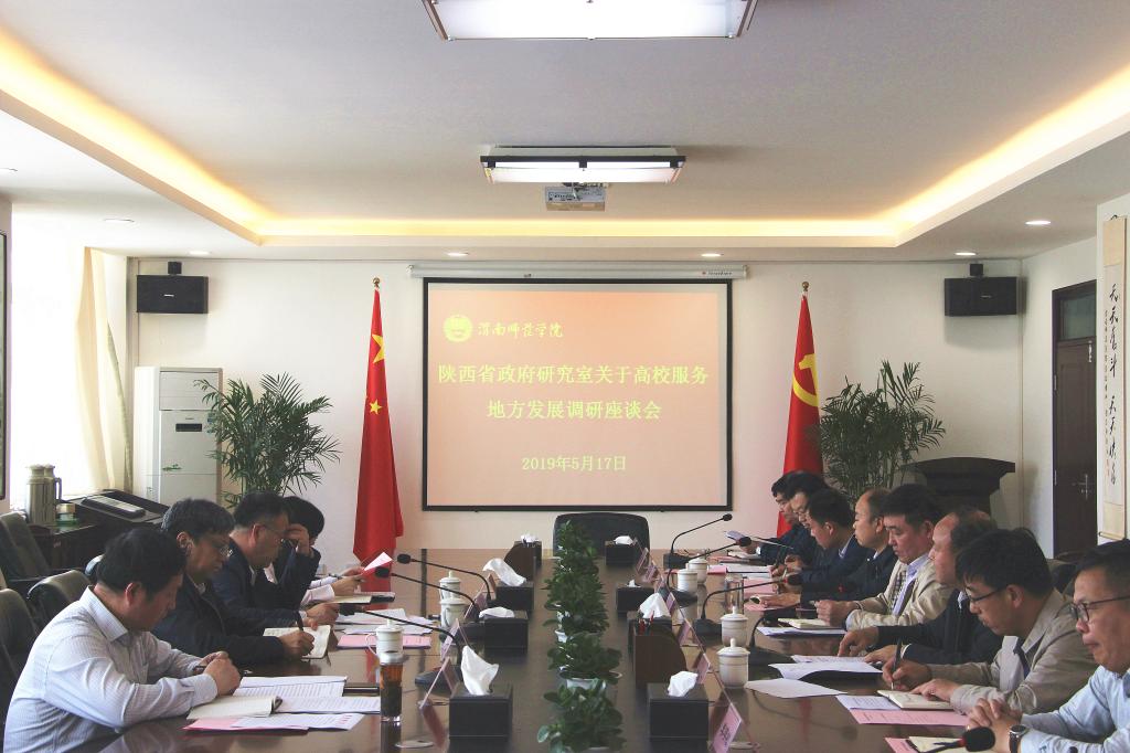 5月17日上午,陕西省政府研究室调研组一行来我校调研服务地方发展现状。调研组由省政府研究室主任杨三省带队,省政府研究室副巡视员、秘书处处长田民孝,省政府研究室社会处副处长赵理顺,省政府研究室秘书处主任科员张文莉参加。党委书记卓宇主持座谈会。