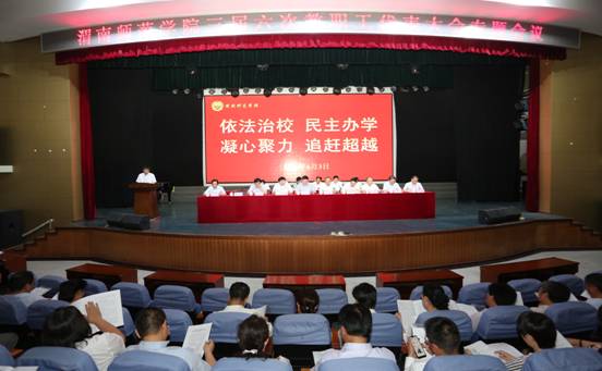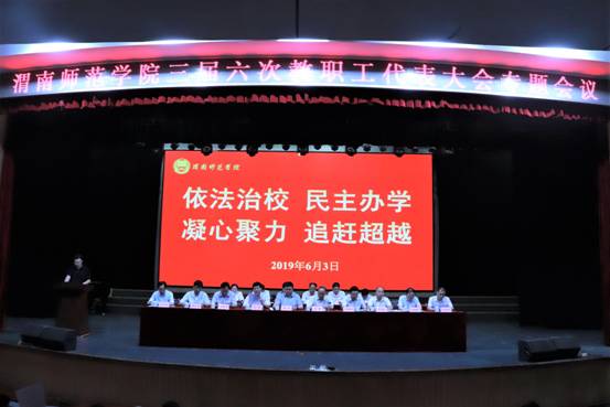 6月3日、6月5日,我校召开三届六次教代会专题会议。审议通过了《关于学校利用汉马校区与渭南市教育投资发展有限责任公司合作举办附属学校事项的报告》、《关于调整“十三五”事业发展核心指标的说明》。校工会副主席王对启主持,全校121名代表参会。