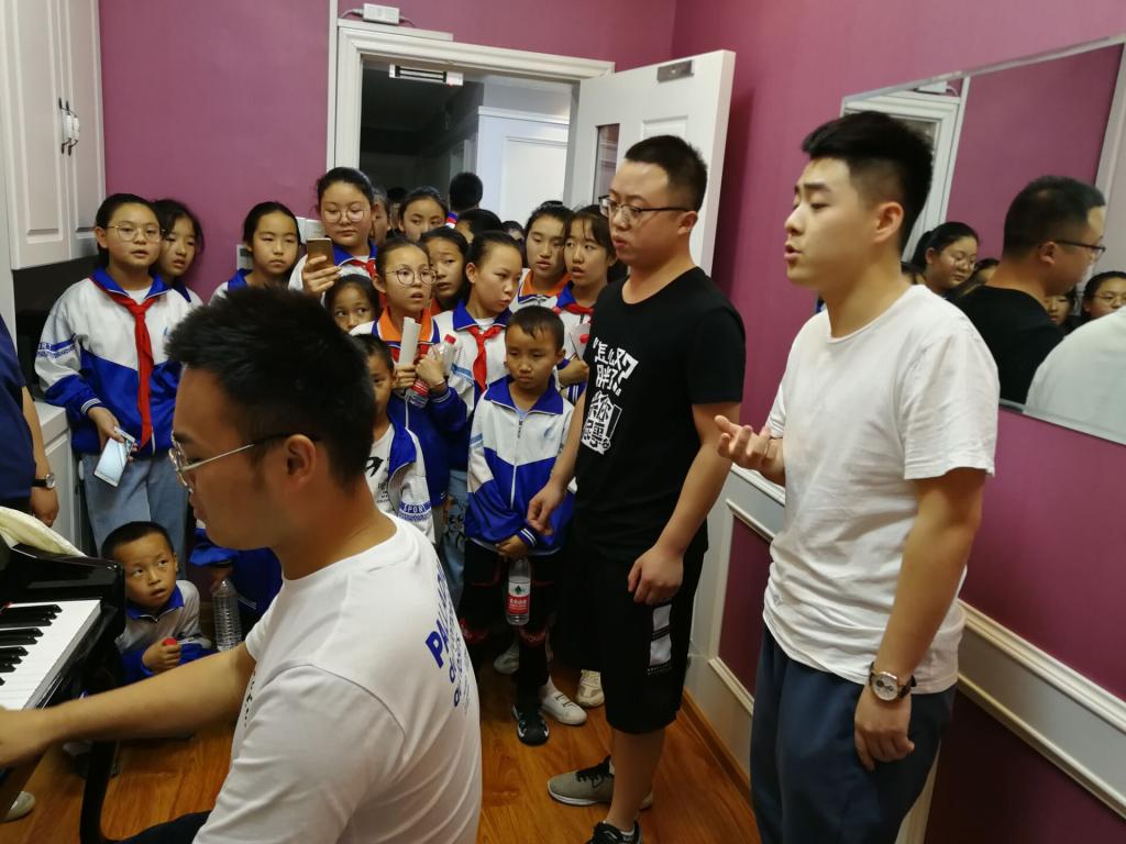 下午1:00,小学生们来到我校音乐学院合唱教室,我校青年教师张浩为小学生上了一堂别开生面的合唱音乐课,教授学生们《我和我的祖国》。小学生们挥舞的国旗、嘹亮的歌声唱出了孩子们对未来生活的向往,唱响了学生对祖国大好河山的热爱,表达了对伟大祖国的衷心依恋和真诚歌颂。
