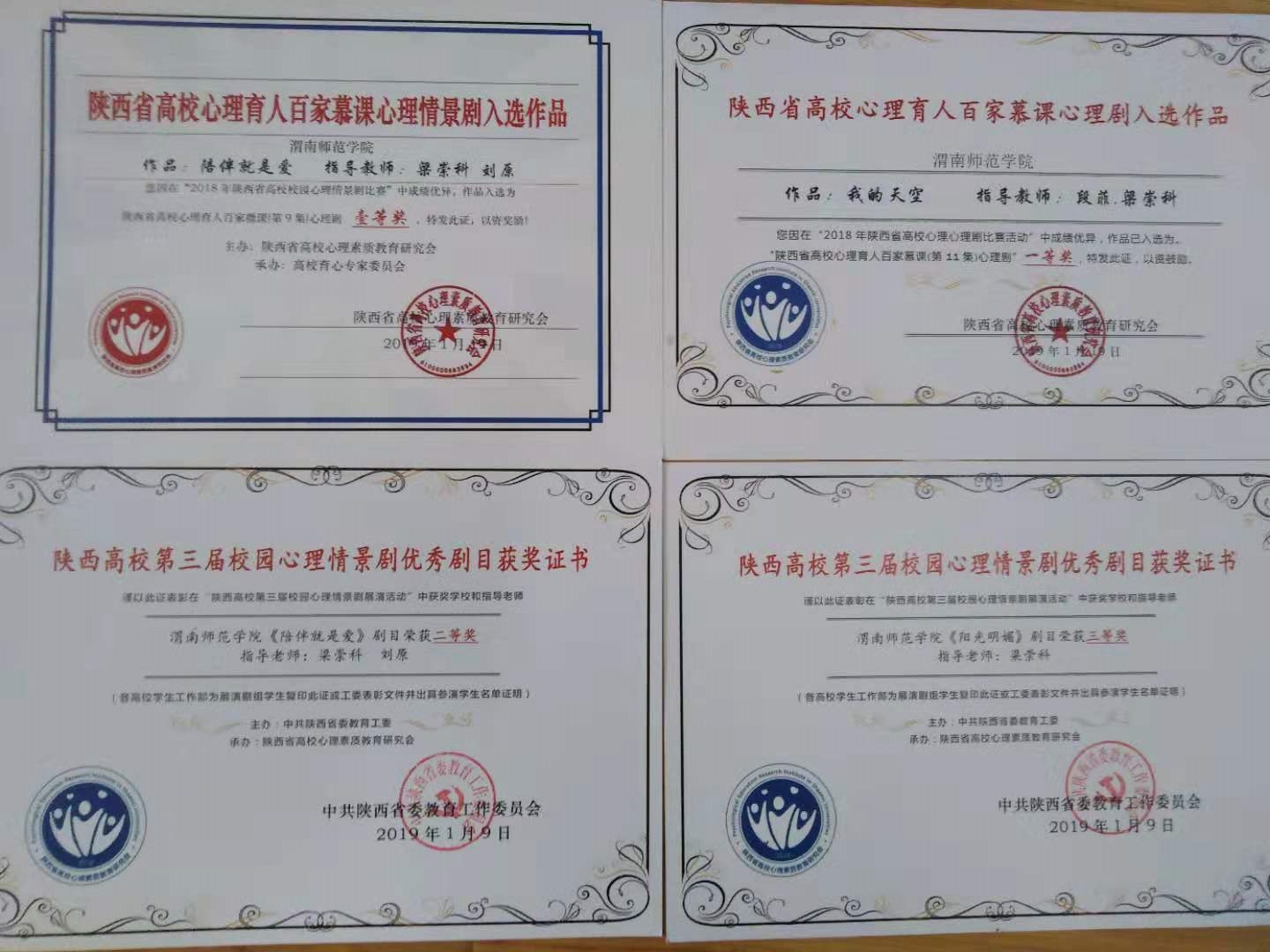 会议全面总结了陕西高校第四届“阳光护航”心理育人宣传季活动,对宣传季活动中的优秀单位和个人进行了表彰奖励,我校在本次会议上获多项表彰奖励。我校大学生心理健康教育指导中心梁崇科教授在2018年全省高校心理育人“教育教学、实践活动、咨询服务、预防干预”四位一体工作领域中,全能成绩优异,荣获“陕西高校心理育人年度人物提名奖”;由我校选送的校园心理剧《陪伴就是爱》、《阳光明媚》获陕西高校第三届校园情景剧优秀剧目二等奖和三等奖,校园心理剧《我的天空》获陕西高校心理育人百慕课心理剧一等奖;我校代表队在陕西高校第四届大学生心理健康科普知识竞赛中获优秀奖;大学生心理健康教育指导中心梁崇科老师的心理教案《我不是孤岛-大学生人际交往》在“陕西高校首届心理健康教育优秀教案”评比中荣获二等奖;教育科学学院严苏风老师的心理微课《抑郁情绪漫谈》在“陕西高校第四届心理微课比赛”中荣获三等奖,教科院学生张睿豪获得2018年度陕西省高校心理委员年度人物入围奖,美术学院学生白玲、经济与管理院学生李思雨获得2018年度陕西省高校百佳心理委员。