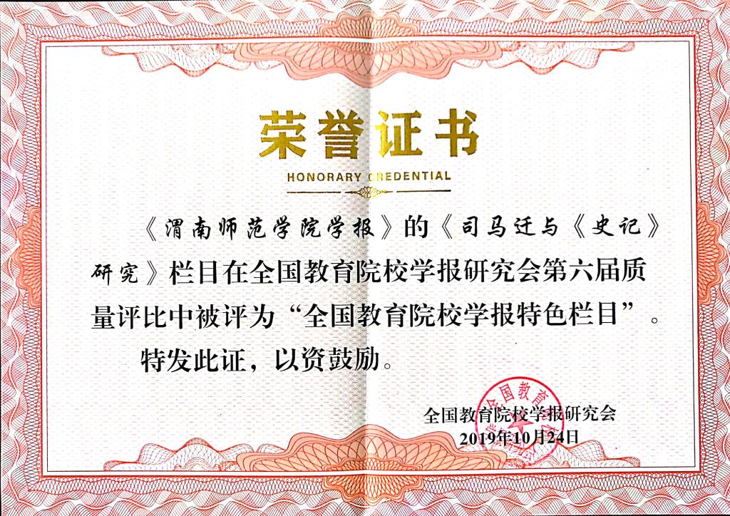 日前,从全国教育院校学报研究会2019年学术年会获悉,《欧宝娱乐官方app学报》荣获“全国教育院校学报精品期刊”,教育部名栏“司马迁与《史记》研究”荣获“全国教育院校学报特色栏目”。此外,詹歆睿、牛怀岗同志分别荣获全国教育院校学报研究会“妙笔奖”。