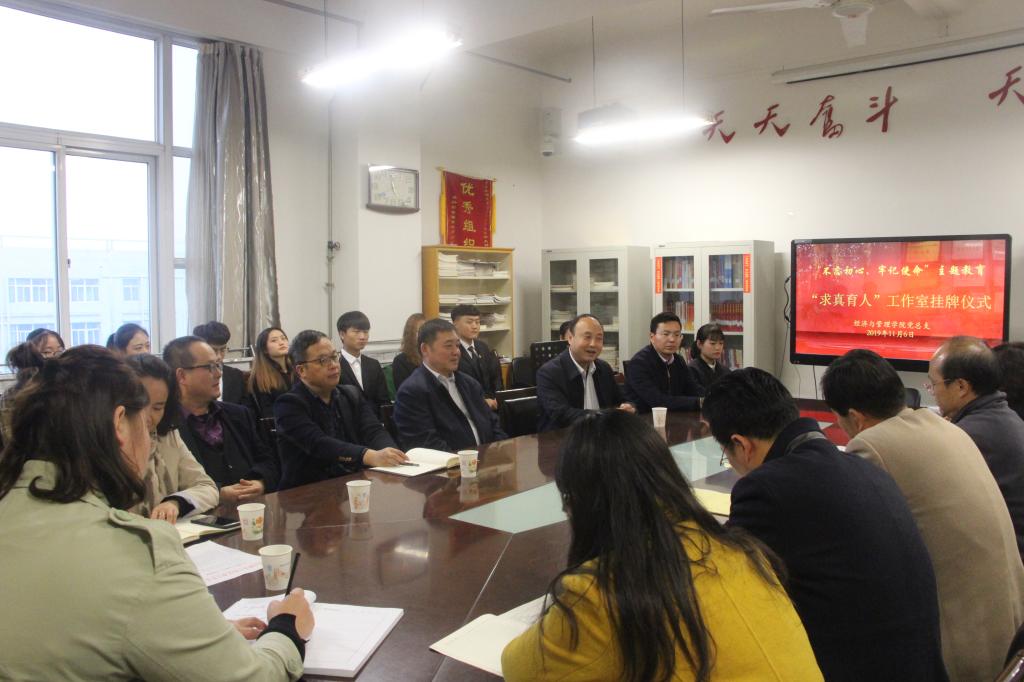“求真育人”工作室负责人经济与管理学院党总支书记魏光民作表态发言。他首先向大家解释了“求真育人”工作室的取名缘由,并介绍了工作室前期建设情况和今后工作的思路打算。他说,“求真育人”工作室取名来自现代高等教育专家顾明远所言:“大学的使命就是求真育人”。“求真育人”工作室的工作目标和责任就是教育学生求真务实、健康成长、全面发展,做合格的“四有”新人。从今年4月以来,经济与管理学院在微信公众号上开设了“书记小喇叭”栏目,到目前已经播出31期,内容涉及思想教育、基层党建、主题教育、安全教育、地方文史等方面。节目播出后,收到了良好的教育效果和社会反响。据不完全统计,“书记小喇叭”栏目近期播出的节目在腾讯网点击观看人数达10000余人次,在学院微信平台师生浏览量达8000余人次,有的节目被大量转发,《渭南日报》等公众平台也转发了部分节目。魏光民表示,“求真育人”工作室正式挂牌后,标志着“书记小喇叭”栏目已经由以前的个人兴趣爱好转变为一种责任担当,由个人的自发行为转变为组织交给的一项使命,由一个学院的行为转变为全校的集体项目。因此,工作室将重新筹划,组织全校热心学生思想政治教育工作的同仁共同开展大学生思想政治教育工作的研究和探索。特别是,将从内容和形式上丰富、创新“书记小喇叭”栏目,不断为师生献上文化、教育的精神盛宴,力争将这一栏目打造成我校校园文化建设的特色平台和重要阵地。
