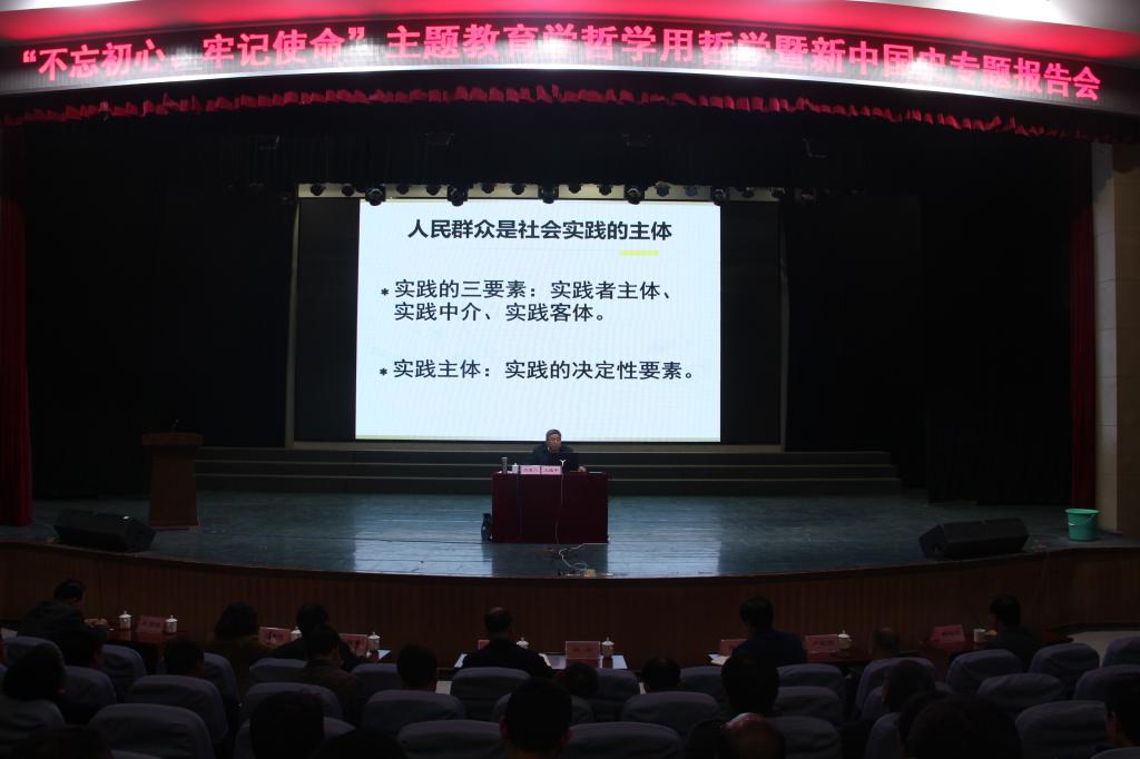 11月12日下午,学校在陶然楼演艺厅举办学哲学用哲学暨新中国史报告会,邀请我校马克思主义学院副教授王战牛、王文涛分别作了题为《不忘初心、牢记使命——人民是历史的创造者》《不忘初心七十年,砥砺奋进铸辉煌》的专题报告,报告会由党委委员、组织部部长凌朝栋主持。