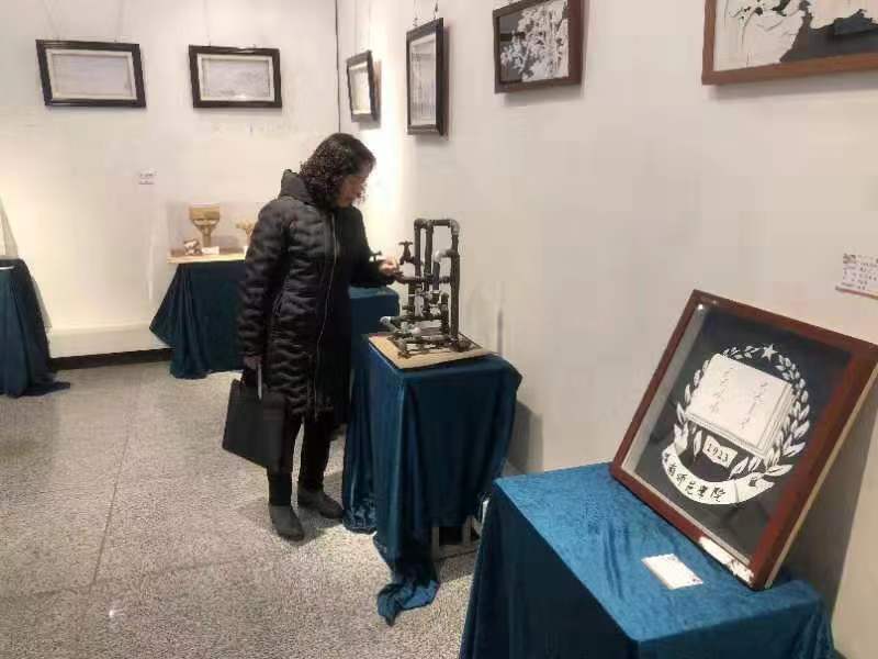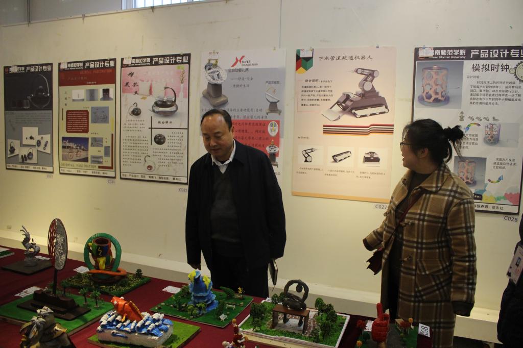 进入逸夫楼,映入眼帘的是手工DIY作品《戏楼》,它以1:60的比例真实地还原了古戏台原貌。其向在场的参观者展现了经千年风雨、历百年沧桑仍巍然屹立的古戏台。第一展厅主要以纸雕作品为主,通过精雕细刻来展现纸张的无穷魅力。纸雕作品《清华园》以多张纸张做为原材料,手工雕刻再现了清华园。第二展厅主要以浮雕、圆雕作品为主。雕塑作品《大明宫景观雕塑》以飞龙在天象征着中华民族的崛起,引发我们对未来生活的憧憬,表现了作者天马行空的奇思妙想,第三展厅主要以产品设计概念图为主。《星空水壶》充分展示了其外观颜色随水温变化而改变的视觉冲击感。美术学院特别为本次展出配备了讲解员,他们生动地为在场领导和师生讲解各类作品制作过程及主要特色。学校领导就有关技术、制作过程等方面的问题与在场师生进行亲切交流,对本次大赛作品展给予了肯定,并提出了指导性意见:在当今信息化时代背景下,应在科技与艺术相融合方面做出努力,不断推进产学研合作,促进作品市场化。并鼓励在场师生,要不断提高动手能力和综合素质,培养创新精神和实践能力,理论联系实际,在科技创新中取得更好的成绩。