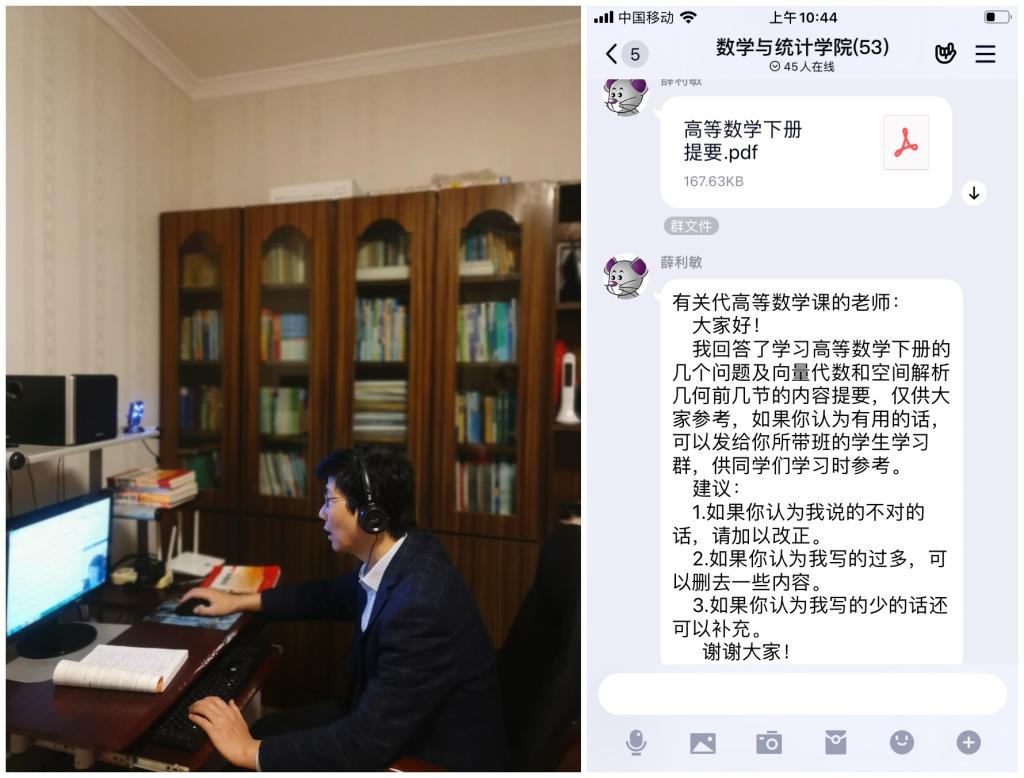 薛利敏,共产党员,教授,学院大学数学公共教学部主任。延期开学前期,薛利敏为全校大学公共数学教学如何开展线上教学积极准备,与系主任赵小鹏网上讨论技术并切磋教学内容讲法。几近退休,他仍然虚心向中青年教师请教线上教学平台操作的技术问题,并指导青年教师如何更好地把高等数学内容展示给学生。在线上教学开展两天后,薛利敏发现在平台上和学生互动效果不好,学生问题较多,就自己回答并整理了高等数学下册中的向量代数和解析几何等问题要点。他还集思广益,在群里征集同课教师的意见,大家纷纷补充,形成了一套更加完善的高等数学同步线上辅导答疑稿。