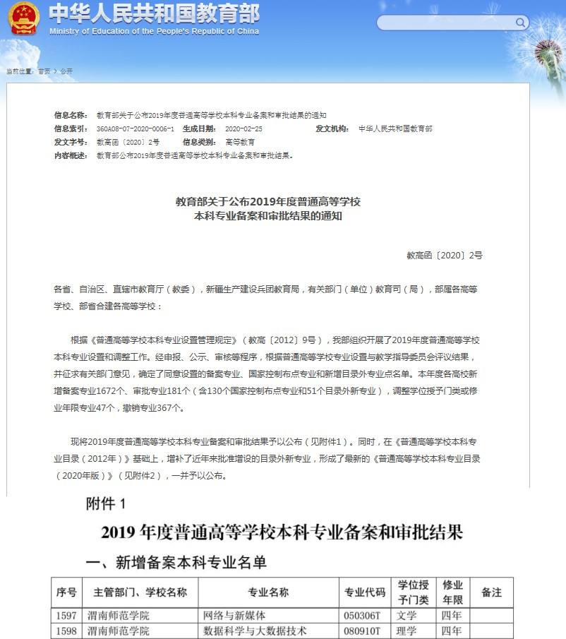 日前,教育部公布了2019年度普通高等学校本科专业备案和审批结果。经申报、公示、审核等程序,根据普通高等学校专业设置与教学指导委员会评议结果,并征求有关部门意见,确定了同意设置的备案专业、国家控制布点专业和新增目录外专业点名单。我校申报的“网络与新媒体”“数据科学与大数据技术”两个本科专业获得教育部批准备案。