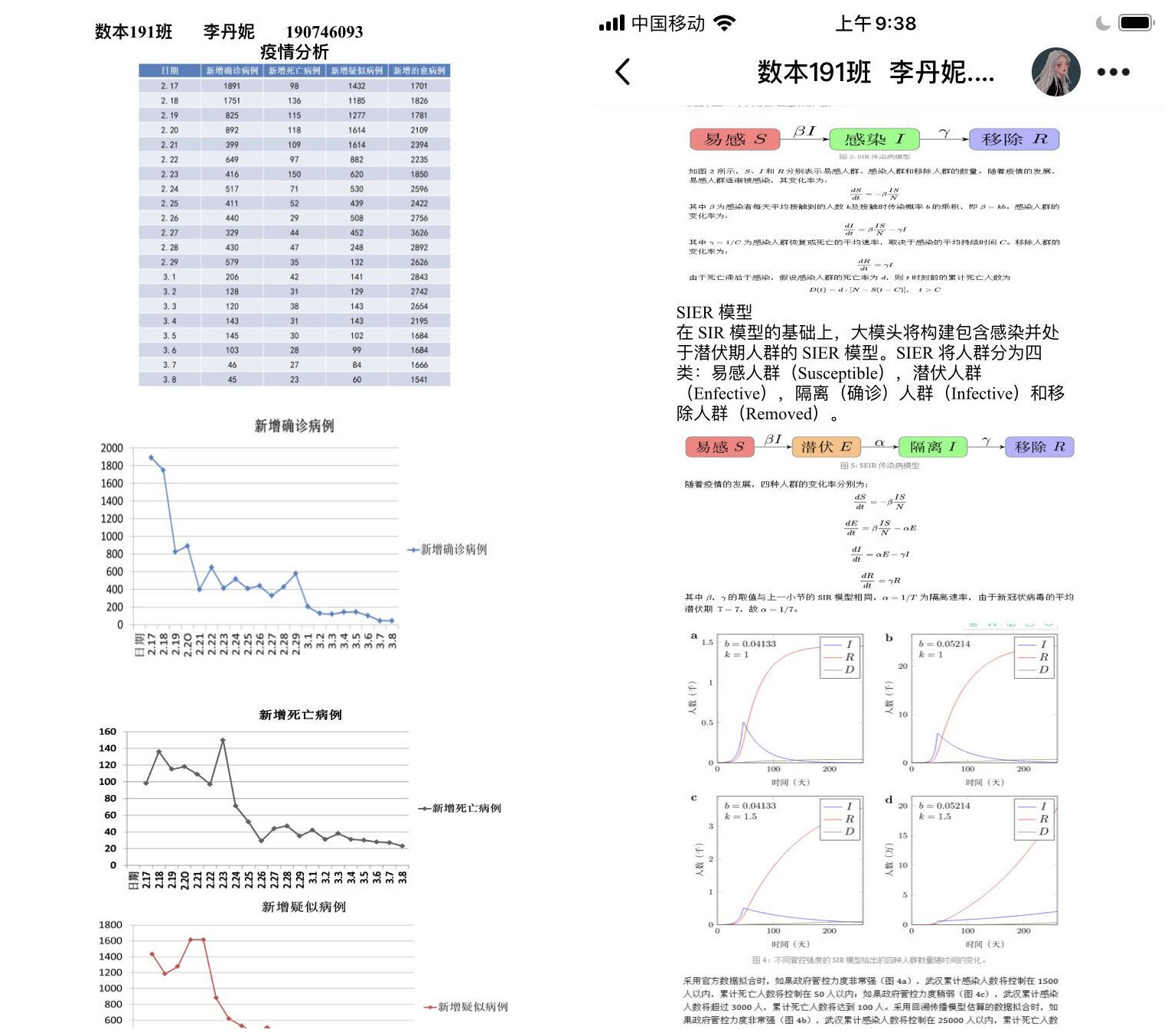 在此次在线教学中,学院任课教师始终没有放松对教学质量的把控,特别在《数学分析》《高等数学》《高等代数》《概率统计》等数学基础课程中强调数学思想和方法的应用。在学生搜集了大量疫情传播数据后,建立模型的微分方程理论,进入统计分析需要用到的数据拟合、最小二乘法、蒙特卡洛算法等数学专业本科生必修课程中的基本内容的学习。其中,数学与应用数学专业191班李丹妮同学在老师的引导和建议下,就根据自己的统计数据,查阅资料,尝试建立了病毒传播的数学模型。虽然她的模型简单,但这是学生运用数学知识的尝试,也是我们人才培养的目标之一。