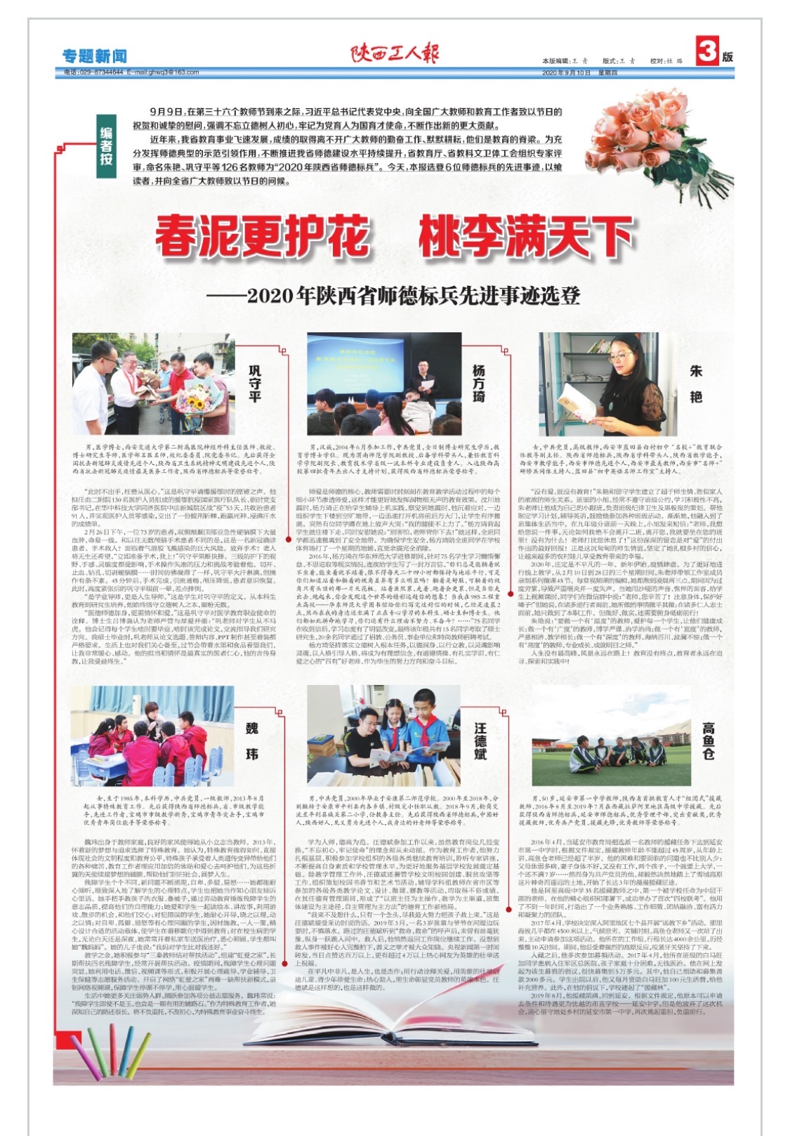 9月10日教师节当天,《陕西工人报》第7561期第03版在“春泥更护花 桃李满天下”选登杨方琦等六位2020年陕西省师德标兵先进事迹。