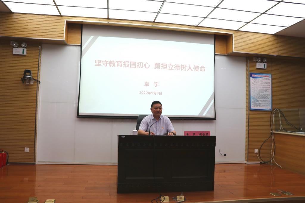 卓宇以《坚守教育报国初心 勇担立德树人使命》为题,为新入职教师讲授岗前培训思政第一课。他要求全体新教师坚定理想信念,做忠诚党的教育事业的践行者;锤炼高尚师德,做塑造学生品德修为的引路人;践行学高为师,做学生学业进步的启迪者;胸怀仁爱之心,做学生健康成长的暖心人;牢记育人使命,做民族复兴“梦之队”的筑梦人;积极履职尽责,做学校事业发展的奉献者。